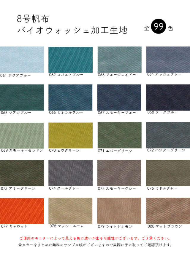 15%OFF【反物販売】全99【倉敷帆布】色8号帆バイオウォッシュ〔カラーNo.041~080〕(t0096-1)|反販売,大口販売,大量購入,送料無料,反物,まとめ買い,帆布,帆布生地,はんぷ,ハンプ,キャンバス,キャンバス生地,無地,生地,トートバッグ,おしゃれ,ハンドメイド